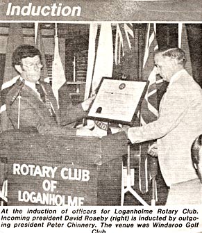 President's Report 1982-83 Fellow Rotarians The theme for Rotary International for year 1983/84 has been 'SHARE ROTARY - SERVE PEOPLE" The Rotary Club of Loganholme has served this theme with distinction, in the following ways: 1. Increased Club membership by a total of 16% In respect of the second part of the theme "SERVE PEOPLE" members of the Club participated in the annual Red Shield appeal in conjunction with students of Shailer Park High School. A significant sum of money was collected from residents in the suburbs of Shailer Park, Kimberley Park, Tanah Merah, and Loganholme. The success of this appeal was the result of the efforts of past member Warren McLaughlin, and his wife Ann, who made their home available as a collection base, and Warren who acted as appeal co-ordinator. I wish to express my sincere appreciation to both Warren and Ann for their effort in the success of the appeal. The Club as a basic objective, made an endeavour to investigate ways and means of establishing a Rotaract Club within the Logan City - Beenleigh area. To this end the Club sponsored a joint meeting of Rotarians, Rotaryannes and guests of Beenleigh, and Logan Clubs - however, this Club is not able to pursue this matter due to business commitments of members at present, but at some future date, and dependant upon the availability of members at that time, it is hoped that, the establishment of a Rotaract Club will again be investigated. There have been many other aspects of Club activities throughout the past year when members and their Rotaryannes have participated in various Club activities. I particularly wish to thank all fellow Club members and Rotaryannes for their support and effort, especially in the co-hosting of District Conference at Caloundra, which was an outstanding success and more recently at the most successful Hoe-down. As far as I am personally concerned, the outstanding highlight of the year was being awarded a Presidential Citation. This citation is a direct reflection of dedication of the collective members of this Club without whose support and effort, the award of the citation would not have been possible. I also wish to express my appreciation to members of the Board for their support and dedication to the ideals of Rotary throughout the year. The business of the Board for the year 1983/84 is now complete, and it is with pleasure that I hand over to incoming President Leo and his Board of Directors, and wish each and every one a most successful year in Rotary for 1984/85. David Roseby Club Service Report 1983-84 The past year has been an active one, particularly as far as membership is concerned. We have seen eight new members inducted since our last changeover, which has added great strength to our club. Unfortunately this has been offset to some extent by a number of resignations during the year - five of our old members have resigned for various reasons and our membership now stands at 21. Similar growth through the coming year but without the same pattern of resignations will see the club in a strong position. Attendance over the year has fluctuated and lack of make-ups has often affected our position on the District Governor's attendance list. My thanks to Don Dellit for his efforts during the year as Attendance Chairman and to John Elms who, during Don's leave-of-absence, filled in for him so ably. The Club Bulletin has continued to record the weekly events of the Club. Early in the year, the format of this went onto computer, which made its production more stream lined. Unfortunately we have not yet found a computer which can actually write up the content and for the first half of the year this task fell to Ray Carter until pressure of business forced him to vacate the post of Bulletin Editor. My thanks to Bob Moses who has helped me produce the Intermesh since then, to Ray for his earlier efforts in writing and producing the bulletin each week, and to Kel Barnes and his students who have taken over production in the last months. Other dual roles during the year have been those of Programme Director, filled originally by Peter Chinnery, but taken over later by Ian West and Sergeant-at-Arms John Pollard who stepped into the breach following the resignation of Warren McLaughlin. My thanks to all for making our weekly meetings enjoyable and informative. Functions during the year have included a Progressive Dinner for members and friends and a joint meeting at the Tavern with Beenleigh and Logan Clubs, the District Rotaract Committee and a number of Rotaractors. We have also been pleased to welcome our Rotaryannes to our Ladies Nights. All were enjoyable evenings of good fellowship. In concluding my report as Club Service Director, I wish incoming Director bob great success during the coming year - I am sure he will receive the same support, which has been given to me during the past year. Barry Swain Community Service Report 1983-84 Owing to the relatively small number of members in our club during the early part of the year, our committee has unfortunately been unable to reach the heights of service, which we would have liked. However we have done our utmost with the available manpower. Our members have given their time and effort to helping the Shailer Park and Loganholme Primary Schools and John Paul College with their fund-raising activities. The Uniting Church's "Arana Heights" project and the Salvation Army's "Red Shield Appeal" also benefited from assistance given. Most of our own fund raising ventures including cash-a-can, the sale of commemorative port at the District Conference and our country and western Ho-down have been highly successful, with only our efforts at Murrarie and Jensons Tree Farm being a disappointment to the club. At this stage of the year we have raised a considerable amount of money to be distributed to worthwhile local organisations, which need our continued help. I would like to thank my committee and all those members who helped out through