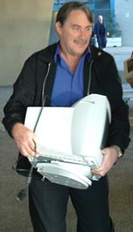 Rotarian Steve Johnson loading computer monitors in his van