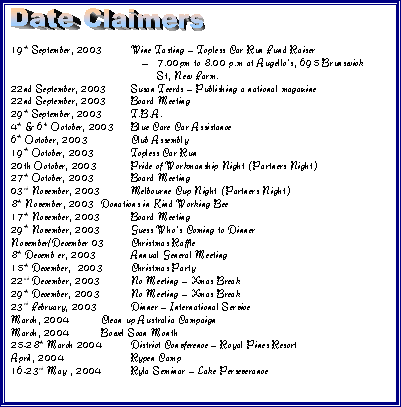 • Topless Car Rally – This is a biggie for the Club this year and we hope that all members will be able to show their support.